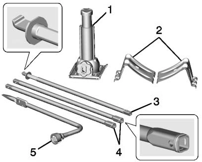 The tools you will be using include the jack (1), the wheel blocks (2), the jack handle (3), the jack handle extensions (4), and the wheel wrench (5).