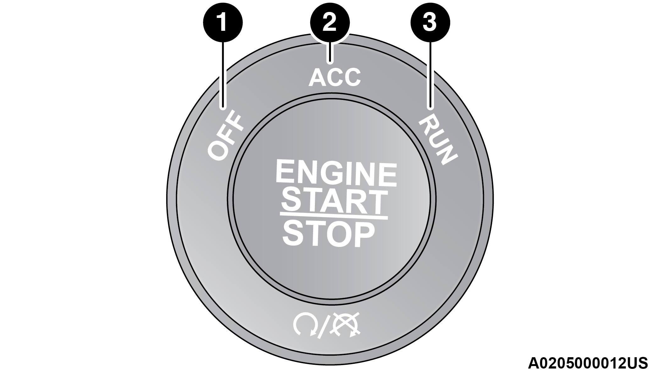 The START/STOP ignition button has several operating modes that are labeled and will illuminate when in position. These modes are OFF, ACC, ON/RUN, and START.
