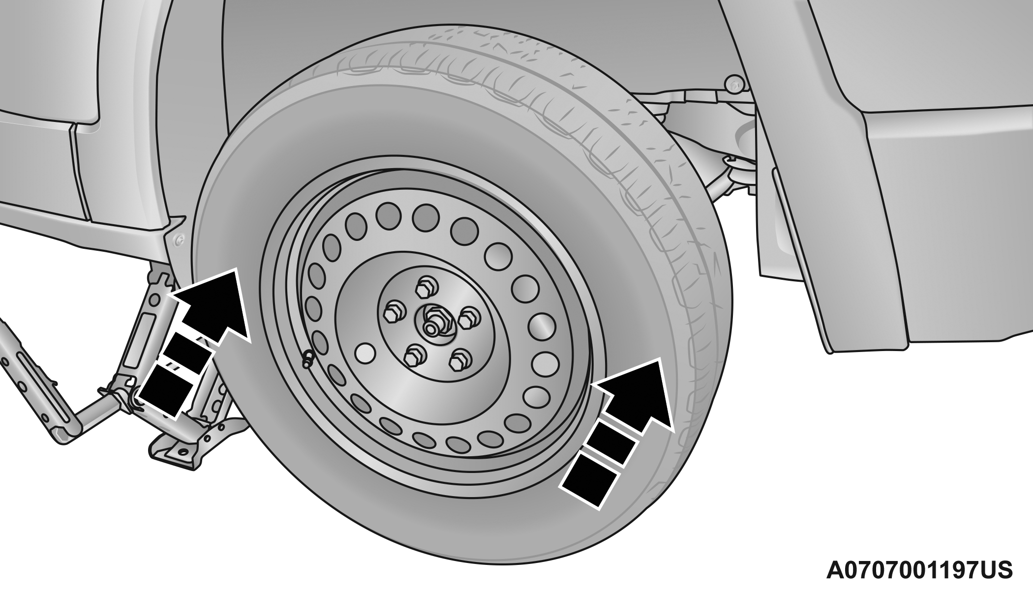 Block both the front and rear of the wheel diagonally opposite the jacking position. For example, if the driver’s front wheel is being changed, block the passenger’s rear wheel.