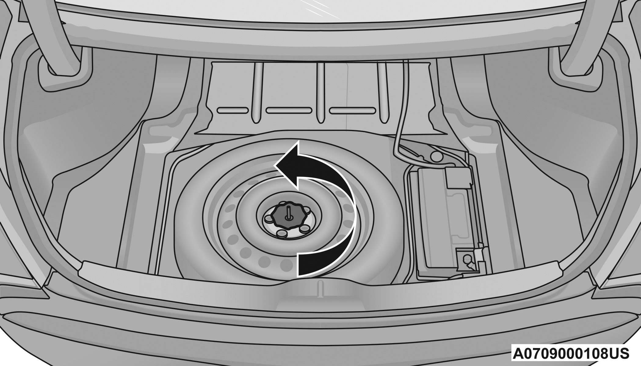 Rotate the fastener securing the spare tire counterclockwise to remove it.