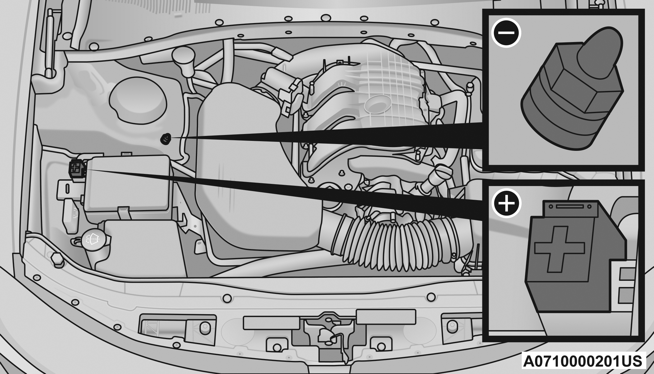 Connect the opposite end of the negative (-) jumper cable to the remote negative (-) post (exposed metallic/unpainted post of the discharge vehicle) located directly behind the underhood fuse box.