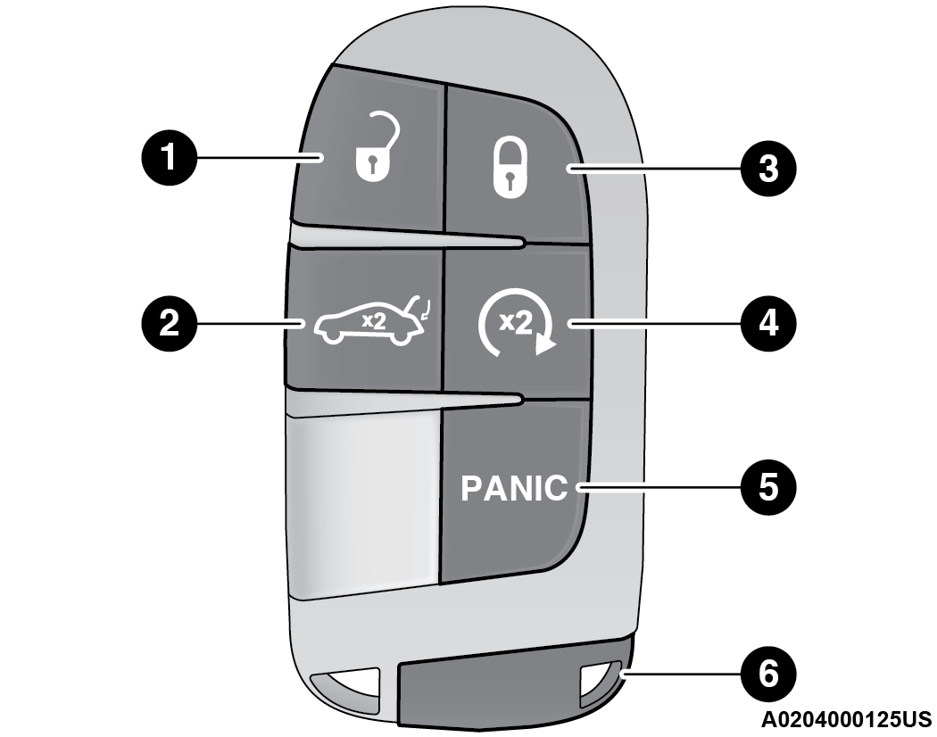 Your vehicle is equipped with a key fob which supports Passive Entry, Remote Keyless Entry (RKE), Keyless Enter ‘n Go™ (if equipped), Remote Start (if equipped), and remote trunk release. The key fob allows you to lock or unlock the doors and trunk from distances up to approximately 66 ft (20 m). The key fob does not need to be pointed at the vehicle to activate the system. The key fob also contains an emergency key, which is stored in the rear of the key fob.