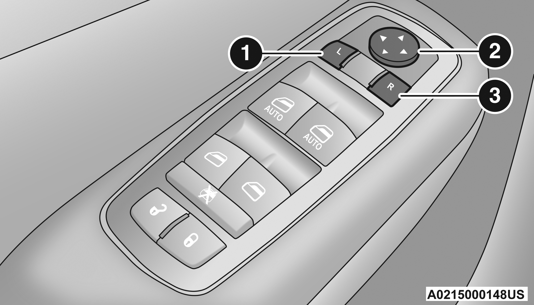 The power mirror controls consist of mirror select buttons and a four-way mirror control switch. To adjust a mirror, push the mirror select button for the mirror that you want to adjust. Using the mirror control switch, push on any of the four arrows for the direction that you want the mirror to move.