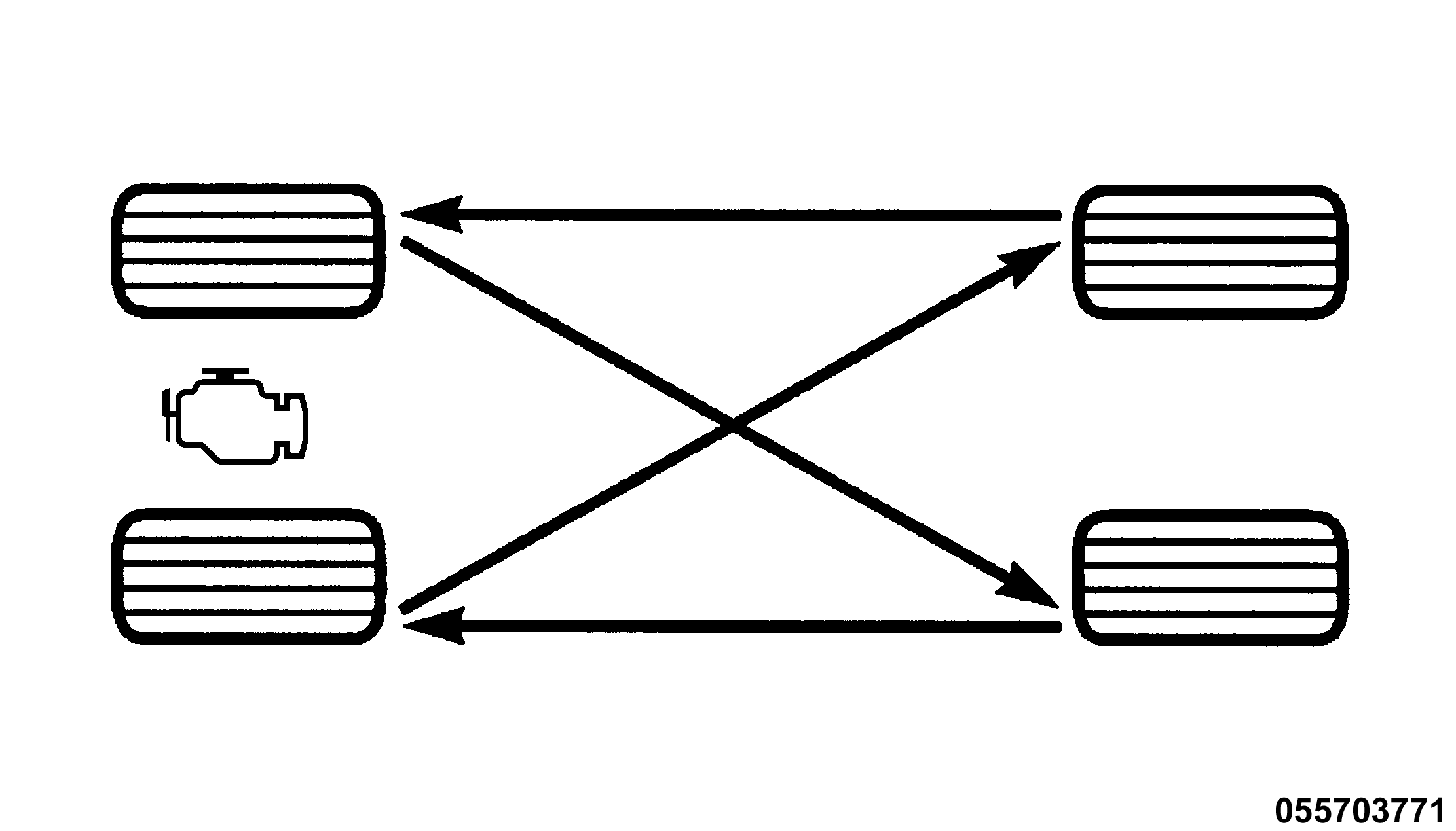 The suggested rotation method is the “rearward cross” shown in the following diagram. This rotation pattern does not apply to some directional tires that must not be reversed.