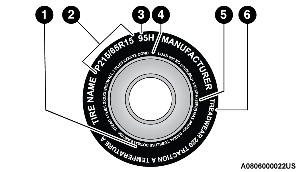 See the Tire Sizing Chart example found in the “Tire Safety Information” section of this manual for more information relating to the Load Index and Speed Symbol of a tire "⇨Tire Safety Information".