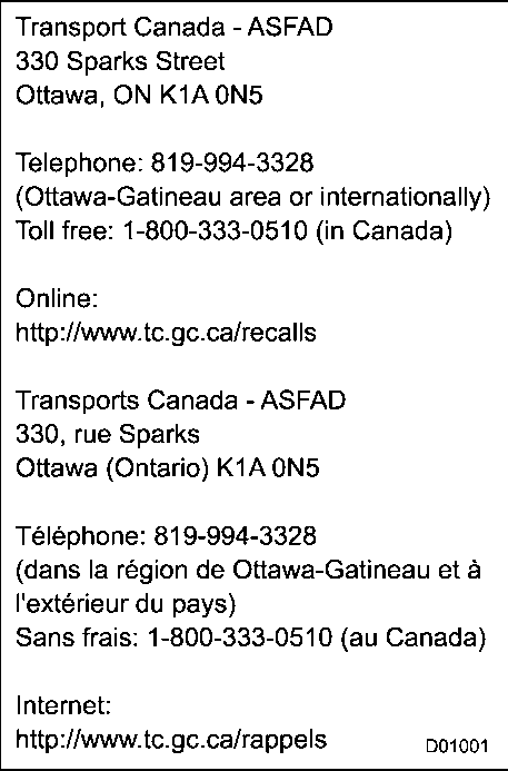 How to contact Trans- port Canada in order to report a safety concern relating to the vehicle (Canada)