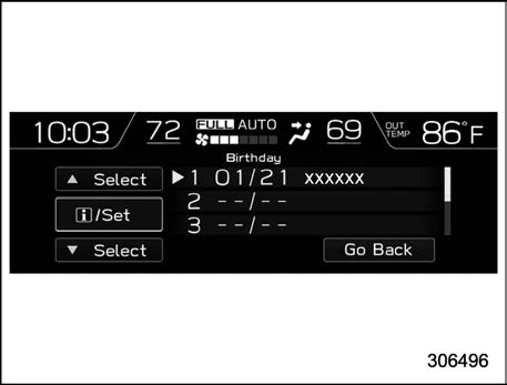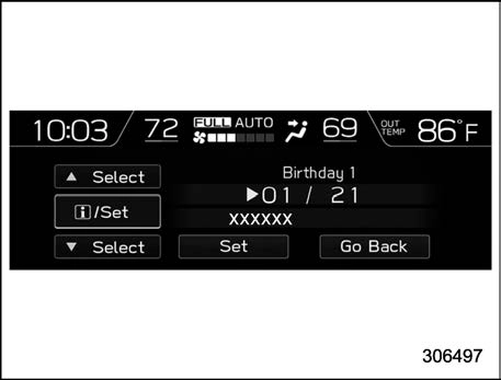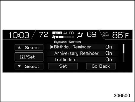 If a birthday or anniversary is approaching, a message will be displayed when the ignition switch is turned to the “ON” position. This function can be set to on or off. For details, refer to “Bypass screen setting” P228.