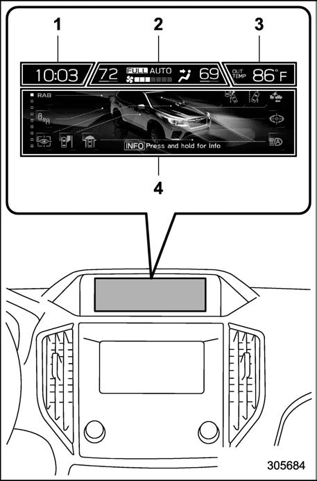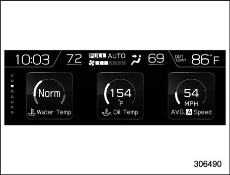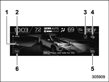 This screen displays the driving status of the vehicle and the operation status func- tions. For functions that are operating, the indicator will illuminate or flash.