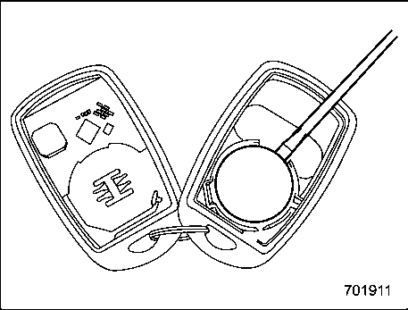 Perform the procedure described in “Re- placing battery of access key fob” P497. For remote engine starter transceiver: The 3-volt lithium battery (model CR-2450) supplied in your remote engine start transmitter should last approximately one year, depending on usage. When the battery begin to weaken, you will notice a