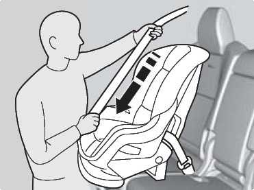 - Route the seat belt through the child seat according to the seat manufacturer's instructions, and insert the latch plate into the buckle. Insert the latch plate fully until it clicks.