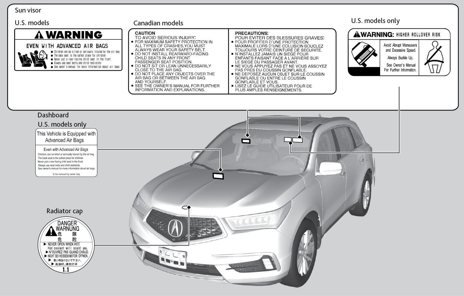 Safety labels are in the locations shown. They warn you of potential hazards that can cause serious injury or death. Read these labels carefully.