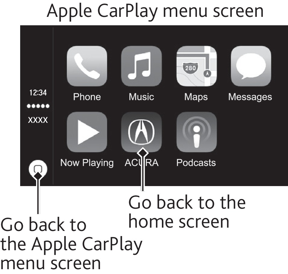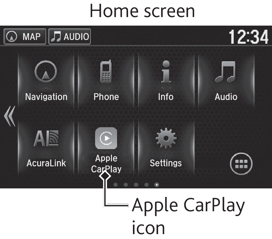 - Phone: Access your contacts, make phone calls, or listen to voicemail. While connected to Apple CarPlay, calls can only be made through Apple CarPlay, not through Bluetooth HandsFreeLink.