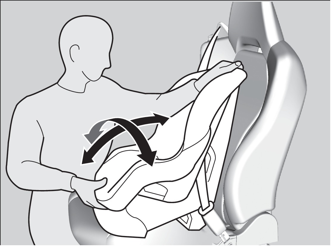 - Make sure the child seat is firmly secured by rocking it forward and back and side to side; less than one inch of movement should occur near the seat belt.