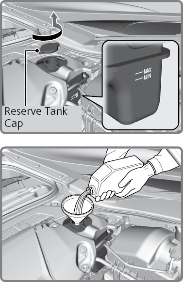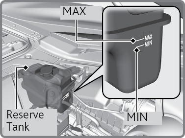 - If the coolant level in the reserve tank is below the MIN mark, add the specified coolant until it reaches the MAX mark.