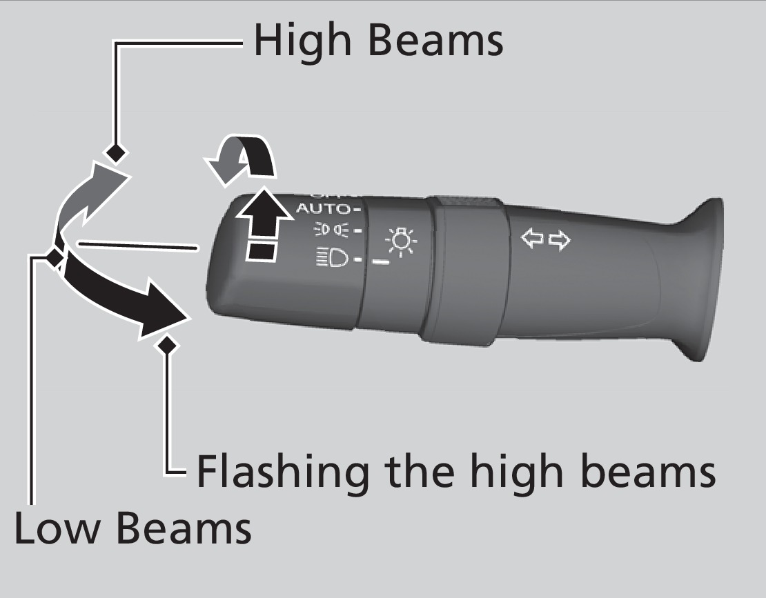 Rotate the switches on the lever to operate the exterior lights. Push the lever forward to turn on high beams. Return the lever to its original position for low beams.