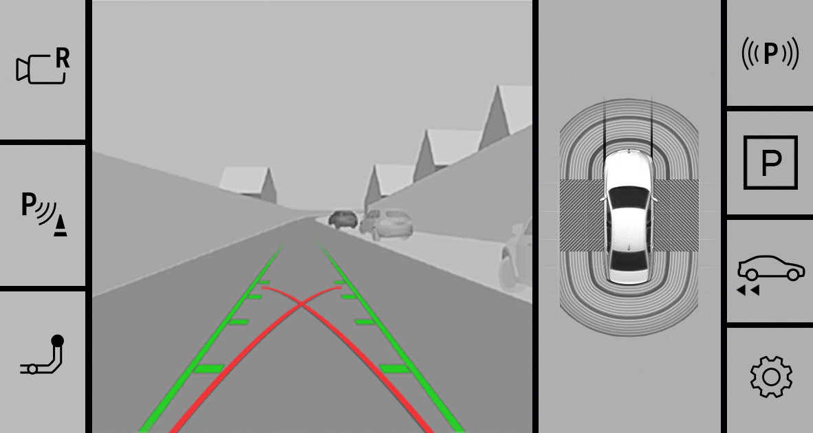 The parking assistance functions are displayed in the right toolbar. The display may vary depending on vehicle equipment.