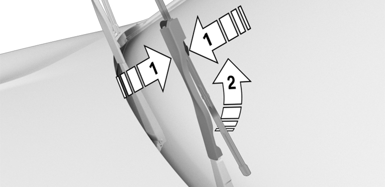 Squeeze the retaining spring, arrow 1, and fold up the wiper blade, arrow 2.