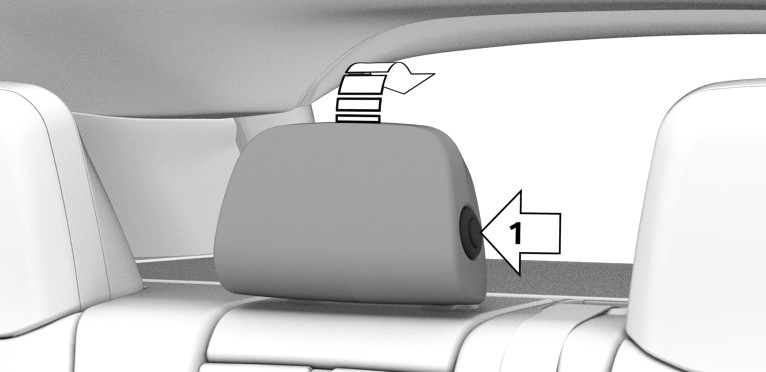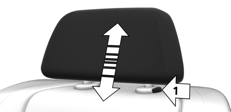 To lower: press the button, arrow 1, and push the head restraint down.