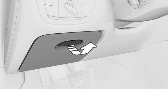 Folded open, the glove compartment protrudes in the car's interior. Objects in the glove compartment can be thrown into the car's interior while driving, for instance in the event of an accident, braking or evasive maneuvers. There is a risk of injury. Always close the glove compartment immediately after using it.