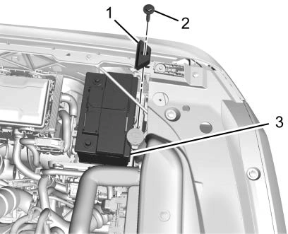 Remove the auxiliary battery retainer bolt (2) and battery retainer (1).