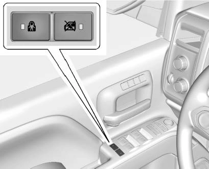 Press { to activate the safety locks on the rear doors. The indicator light comes on when activated. Press { again to deactivate. The vehicle must be on, in ACC/ACCESSORY, or in Retained Accessory Power (RAP). See Retained Accessory Power (RAP) 0 251.