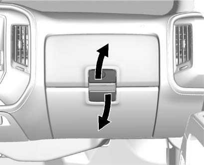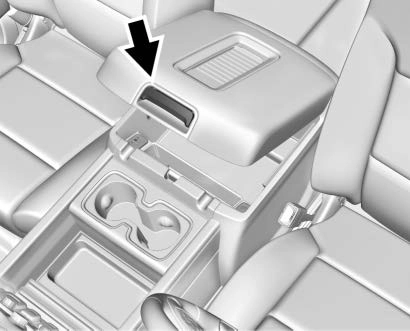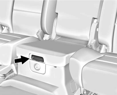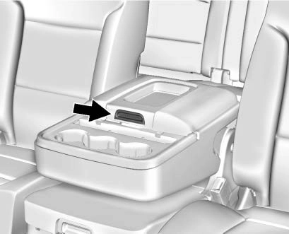 If equipped, press the latch and lift to open. Depending on the options there may be a tote compartment, accessory power outlet, auxiliary jack, and USB port(s) inside. There are openings for power cords on the edge of the storage area.