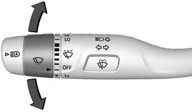L : Press L on the windshield wiper control to spray windshield washer fluid and activate the wipers. The wipers will continue until L is released or the maximum wash time is reached. When L is released, additional wipes may occur depending on how long the windshield washer had been