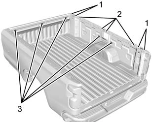 Structural members (1) and (2) are included in the pickup box design. Additional accessories should use these load points. Depending on the accessory design, use a spacer under the accessory at the load points to remove gap. The holes for GM approved accessories (3) are not intended for aftermarket equipment. See www.gmupfitter.com for additional pickup box load bearing structural information.