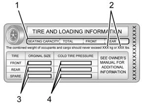 The Tire and Loading Information label also shows the size of the original equipment tires (3) and the recommended cold tire inflation