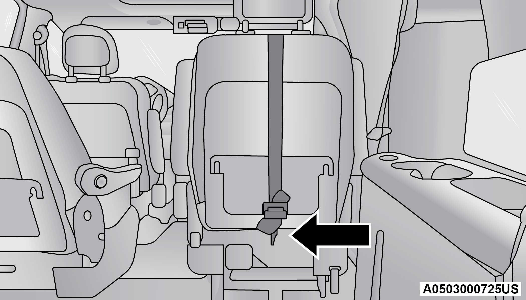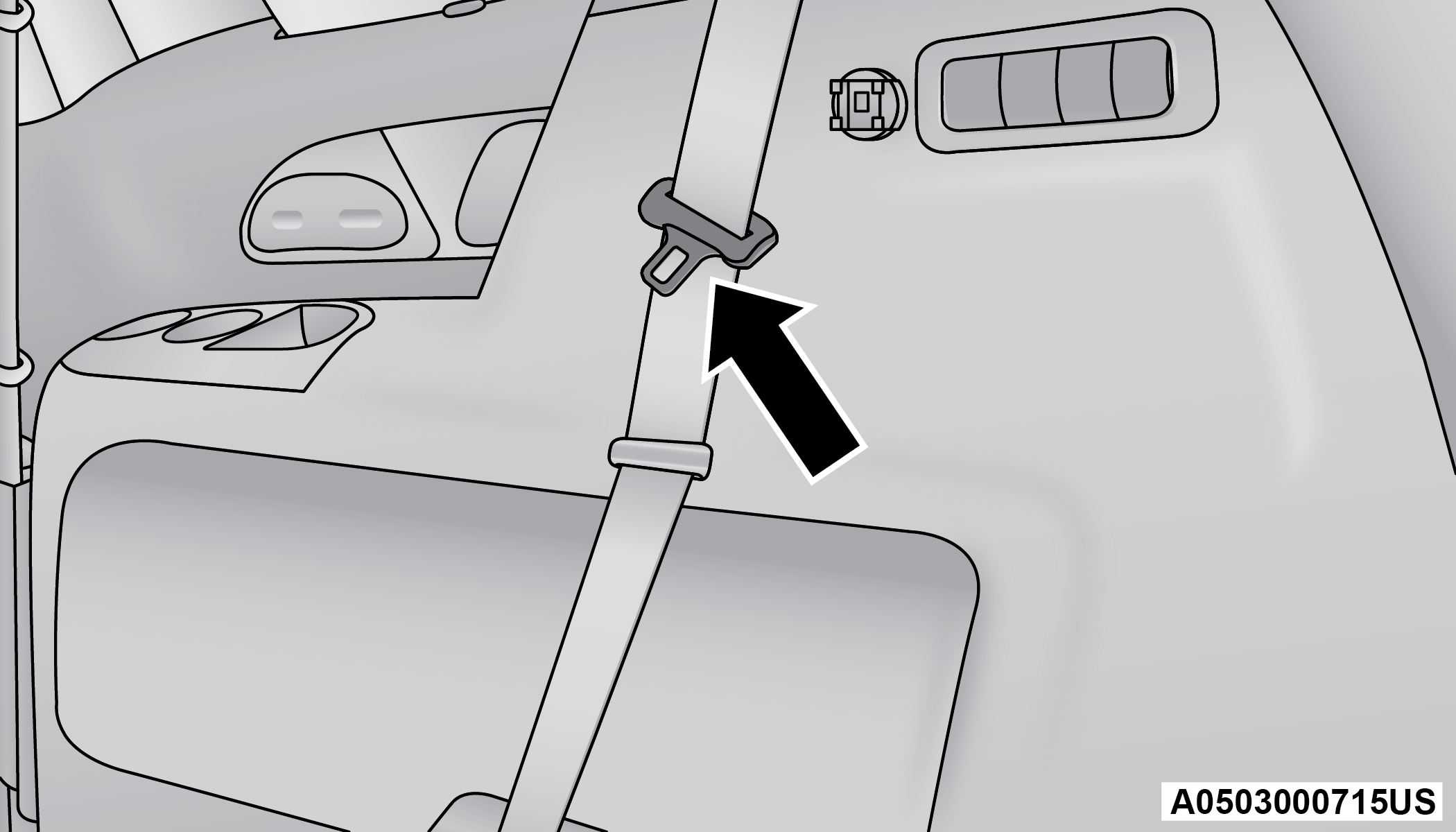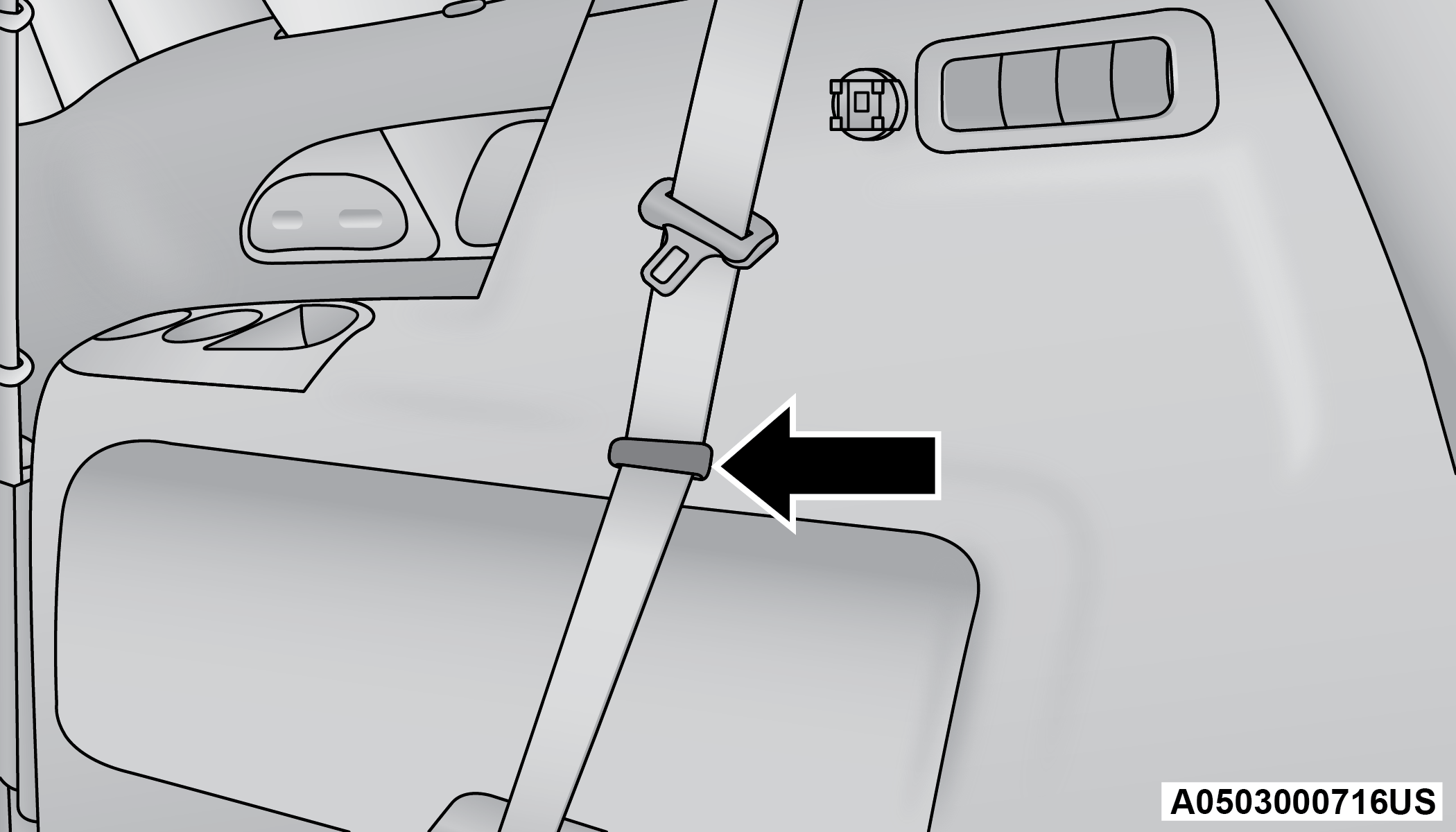 The second row center (if equipped) and third row center seat belts feature a seat belt with a mini-latch plate and buckle, which allows the seat belt to detach from the lower anchor when the seat is folded. The mini-latch plate and regular latch plate can then be stored out of the way in the headliner for added convenience to open up utilization of the storage areas behind the front seats when the seat is not occupied.