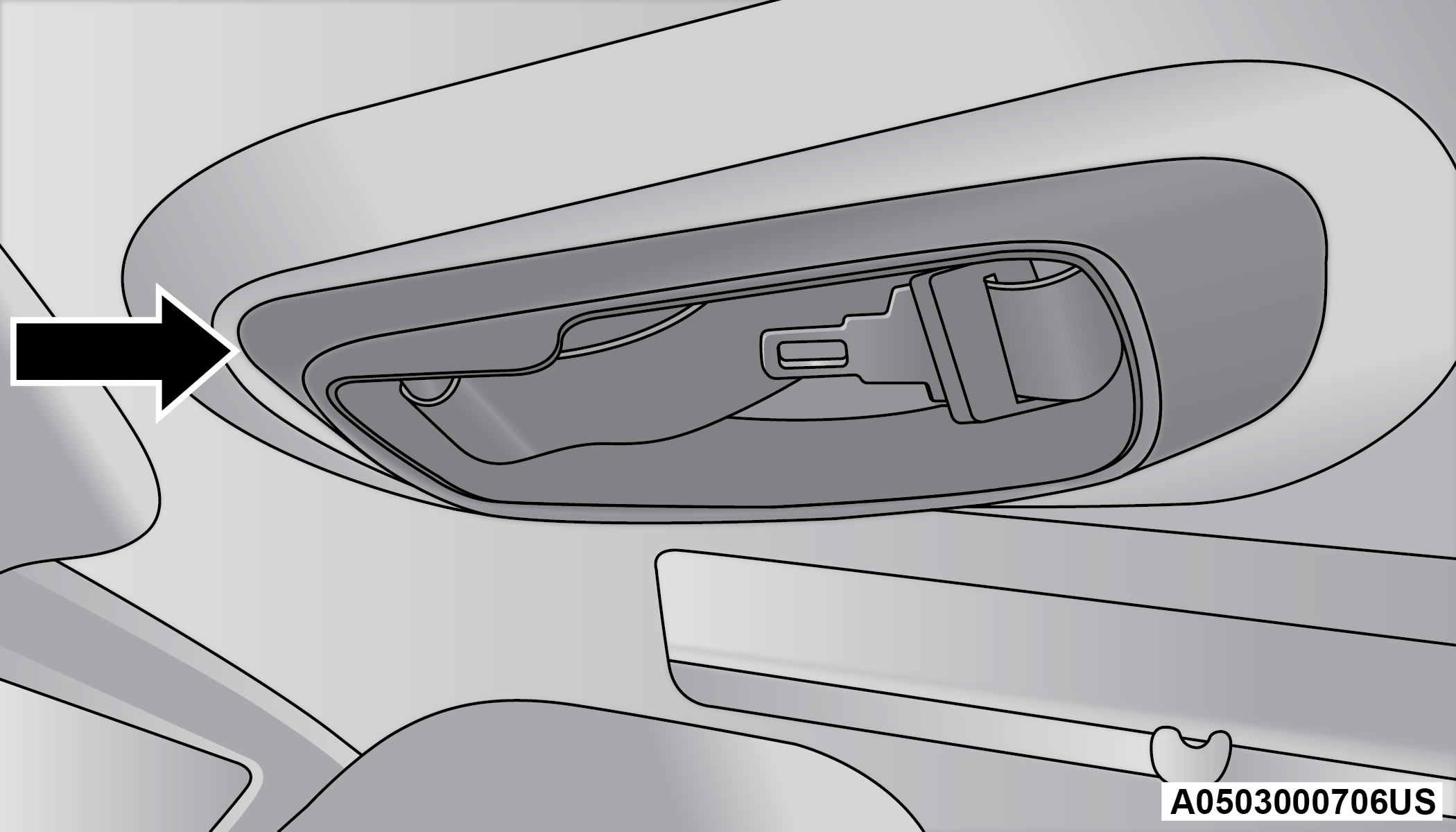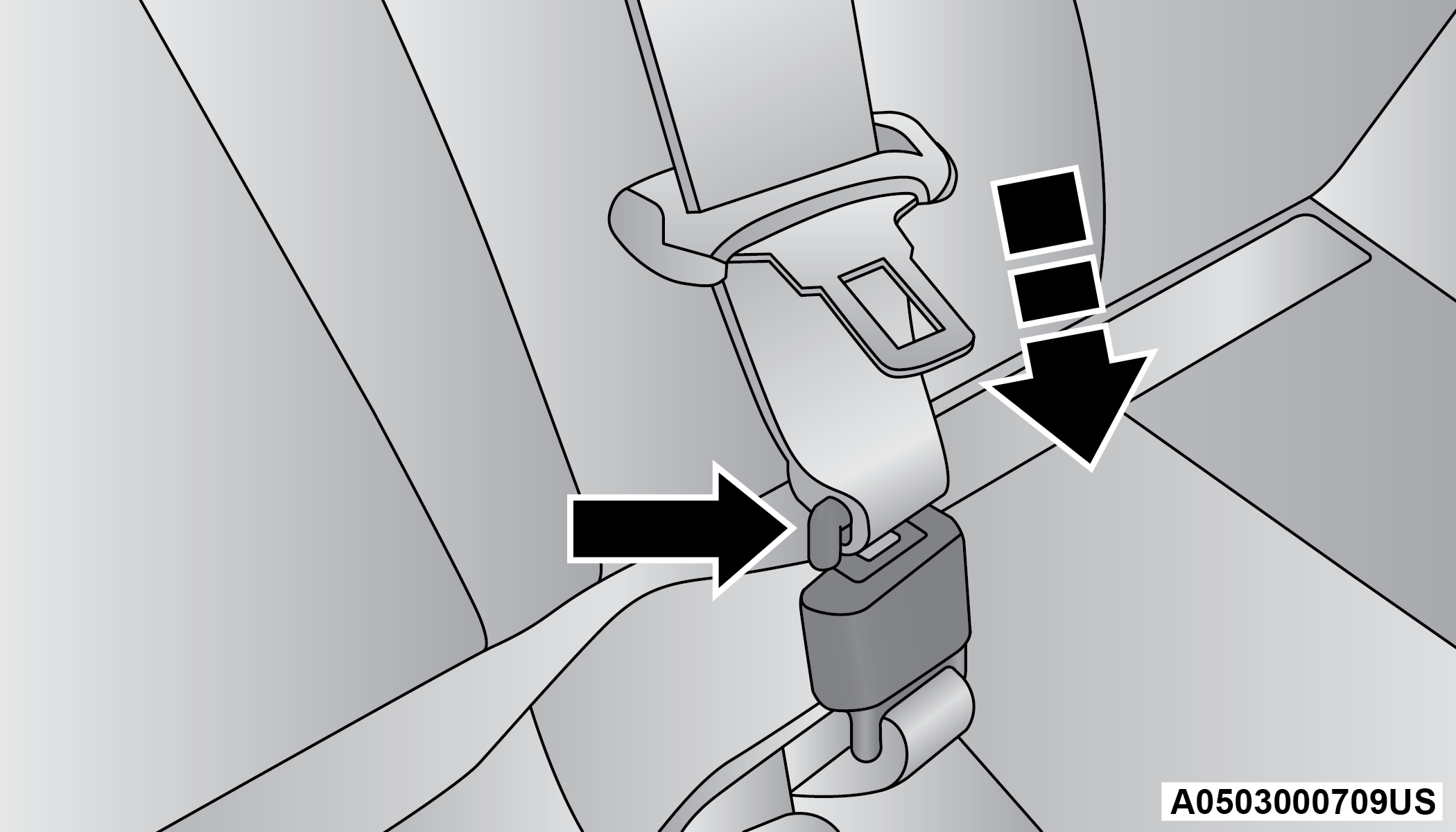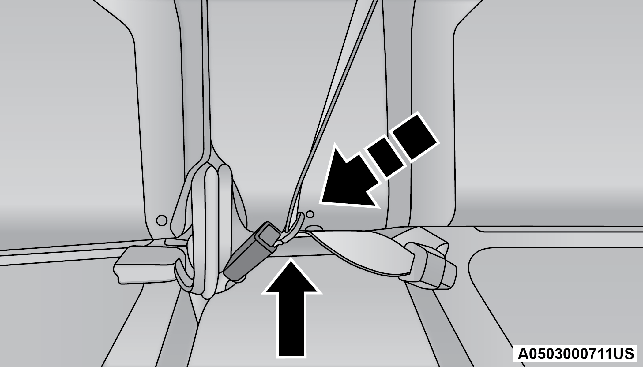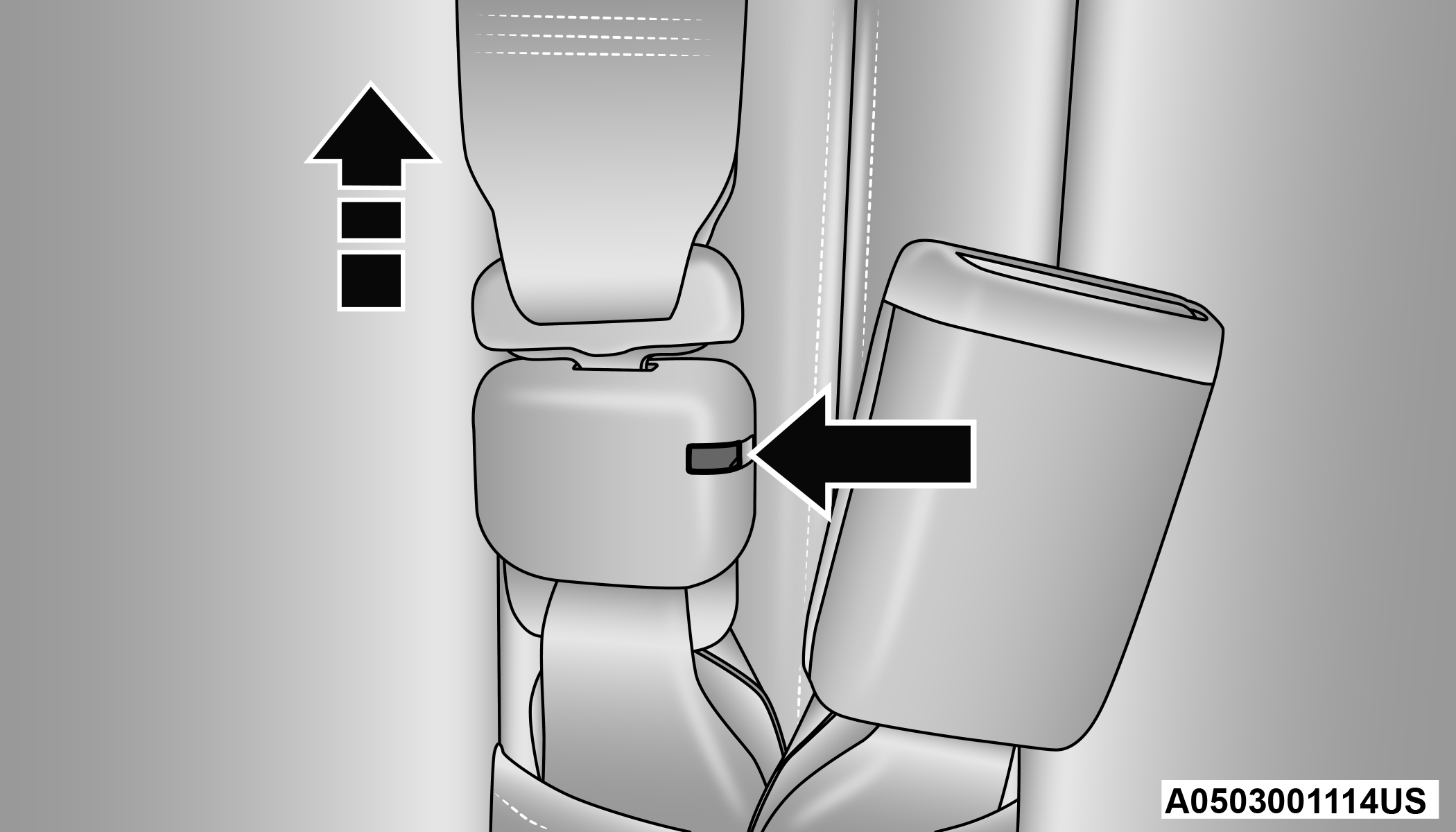The second row center (if equipped) and third row center seat belts feature a seat belt with a mini-latch plate and buckle, which allows the seat belt to detach from the lower anchor when the seat is folded. The mini-latch plate and regular latch plate can then be stored out of the way in the headliner for added convenience to open up utilization of the storage areas behind the front seats when the seat is not occupied.