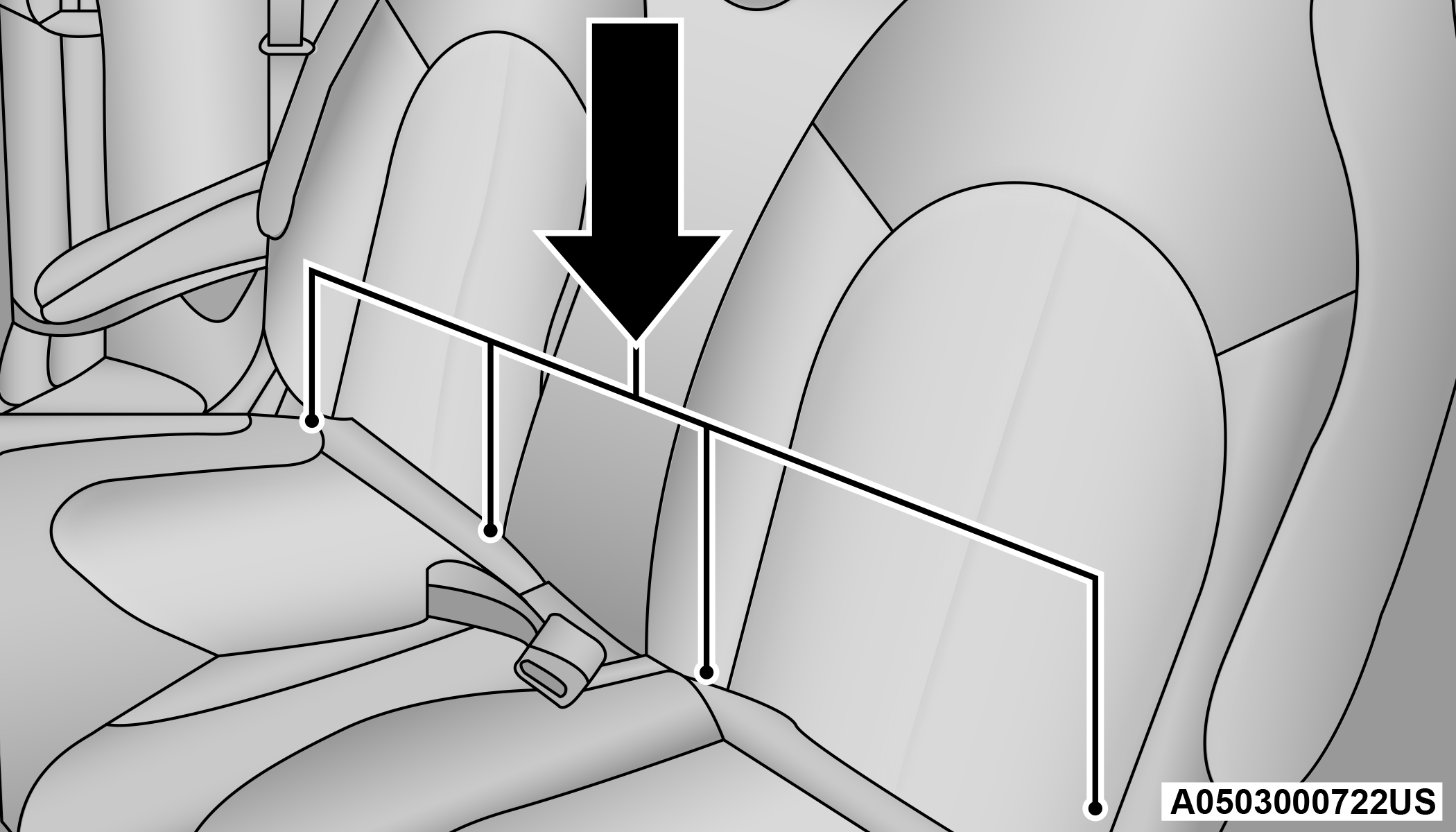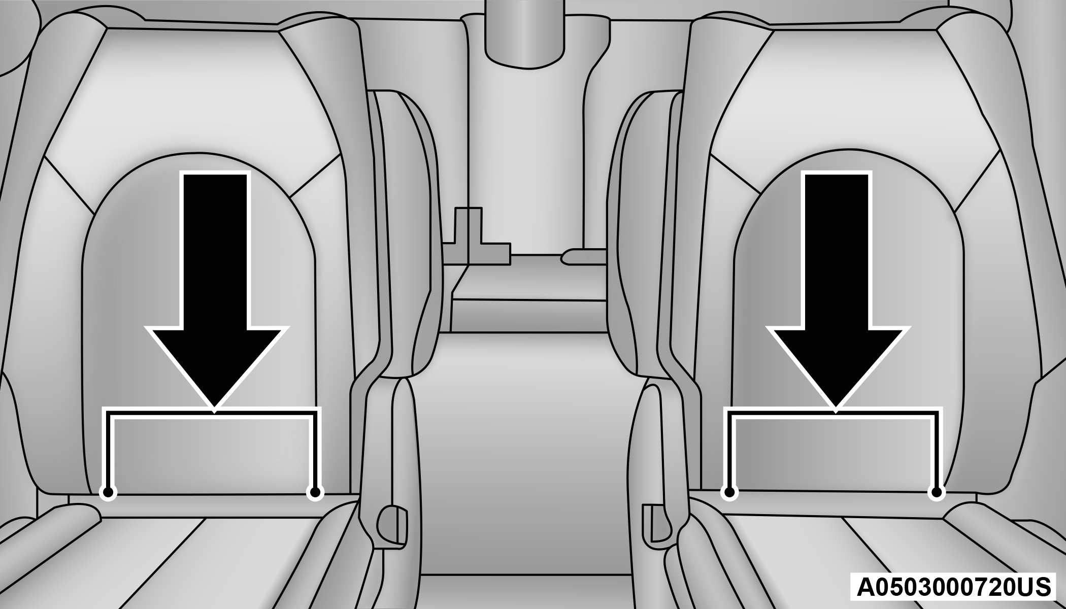 If the car seat is in the center, raise the center head restraint and route the tether strap around the inboard (left) side of the head restraint support posts, as shown in the diagram.