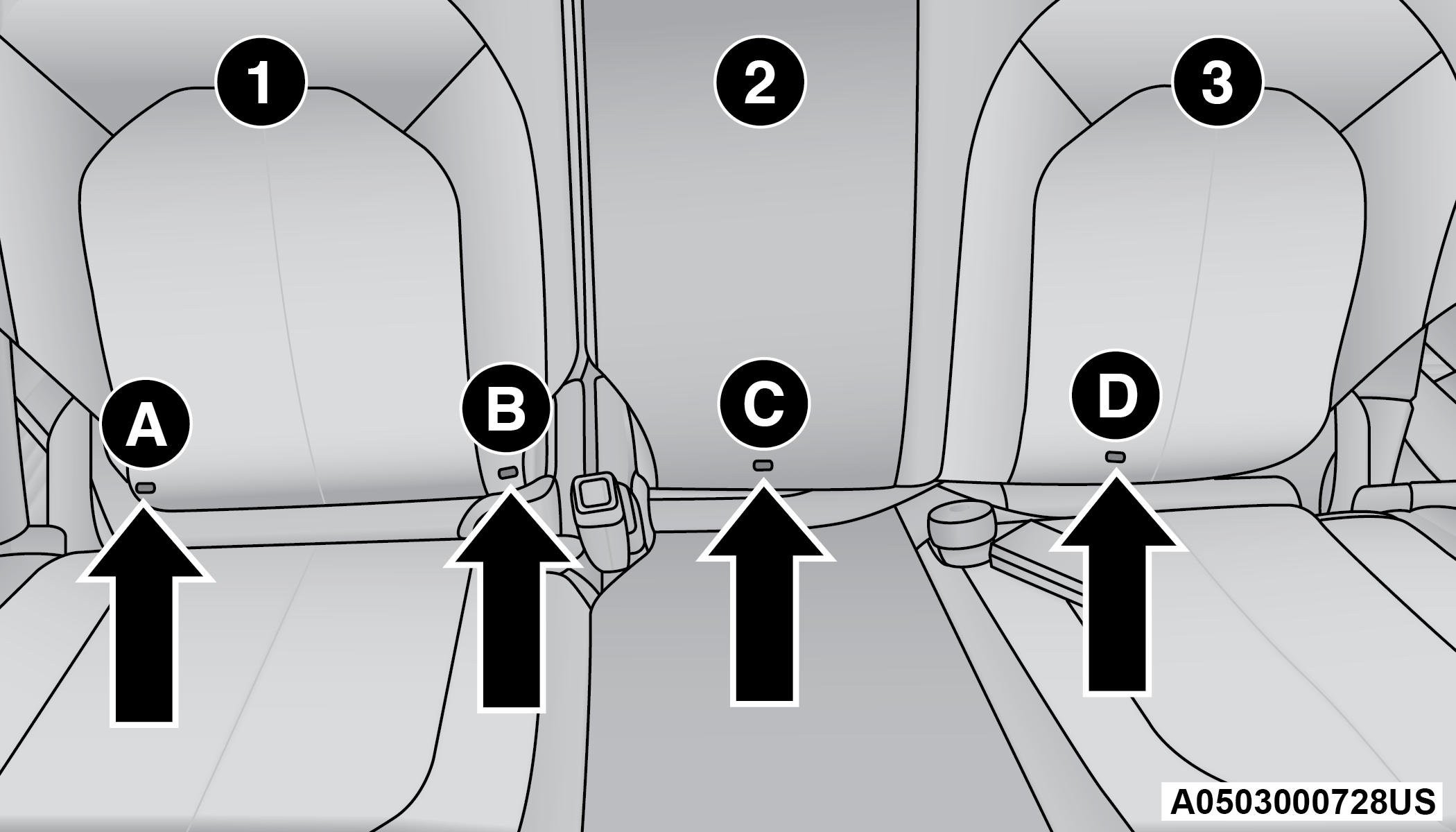 This vehicle has 4 lower LATCH anchorages in the third row, rear seat. Anchorages A and B are used for the right outboard position behind the front passenger (1). Anchorages C and D are used for the center seating position (2). The left outboard position (3) does not have lower anchorages. Do not install a child restraint using anchorages B and C. This is not a LATCH position in your vehicle.