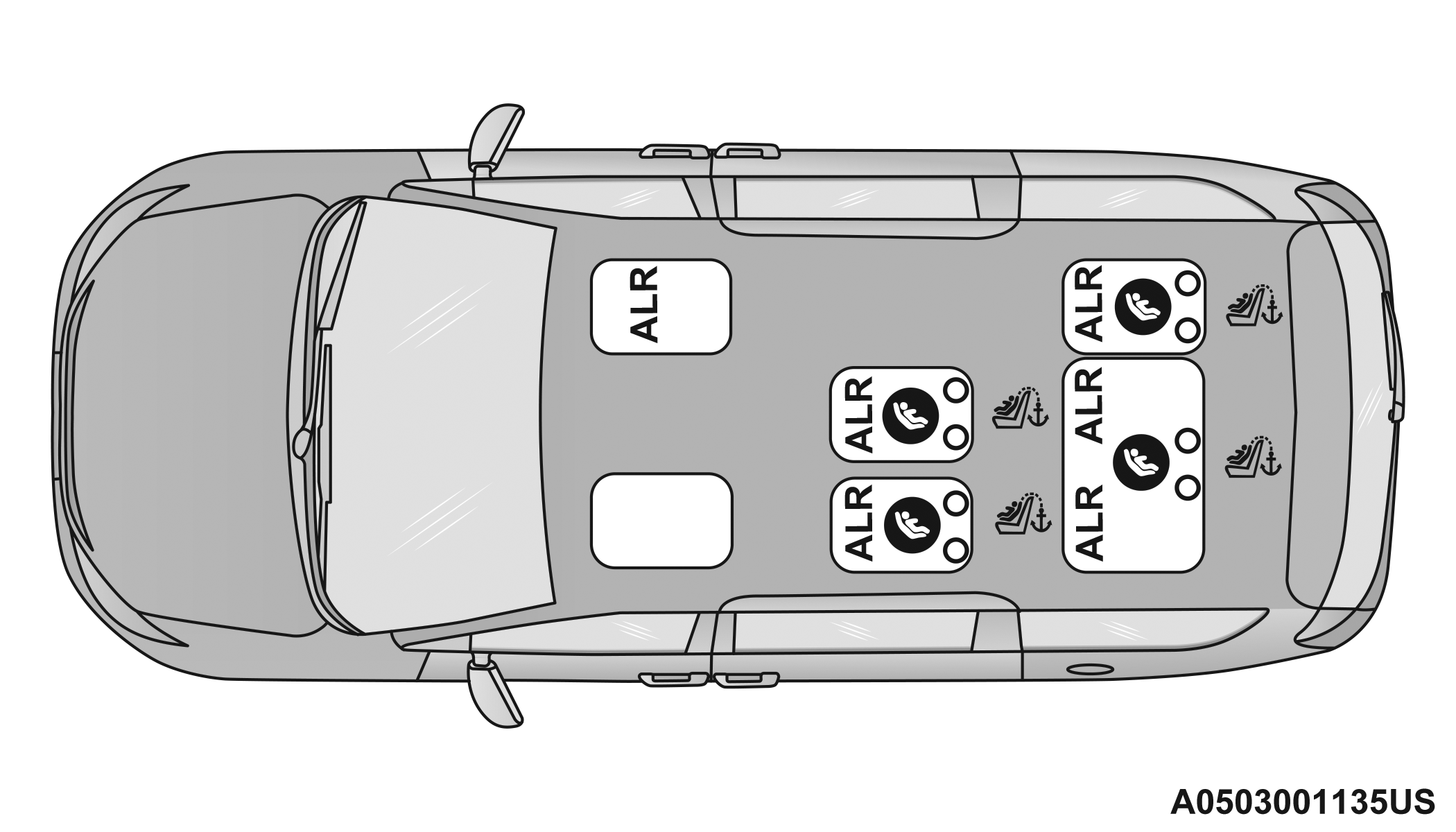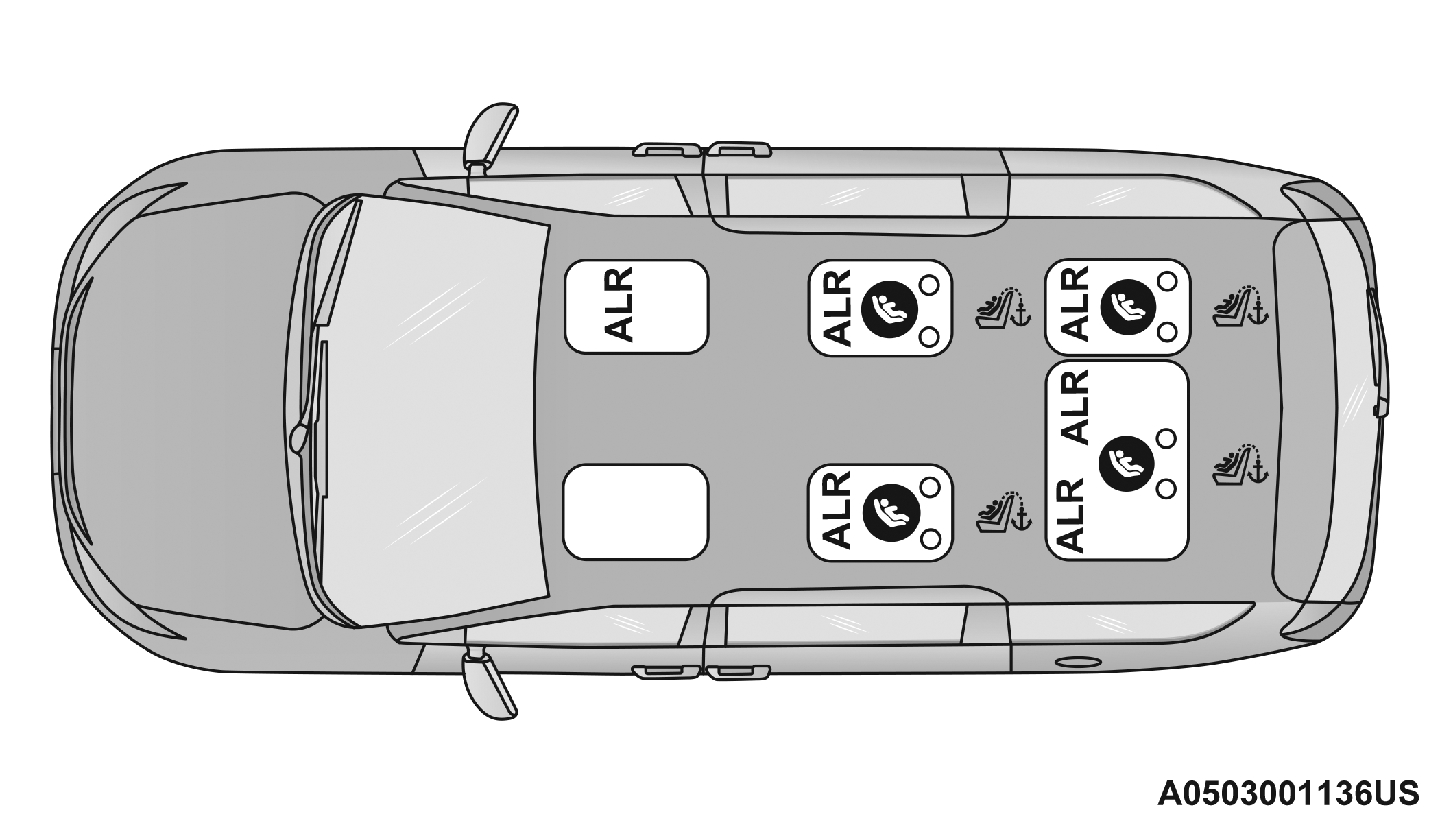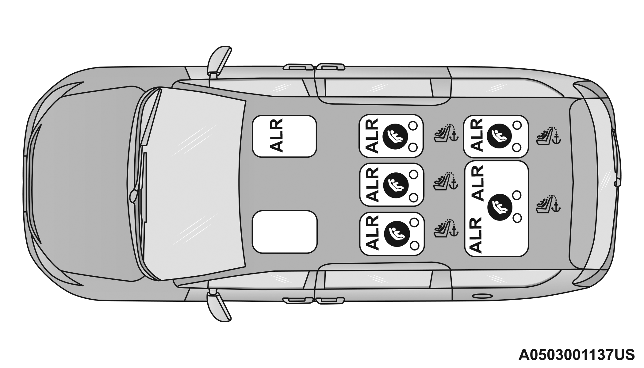Seven Passenger Stow 'n Go Seating Automatic Locking Retractor (ALR) Locations