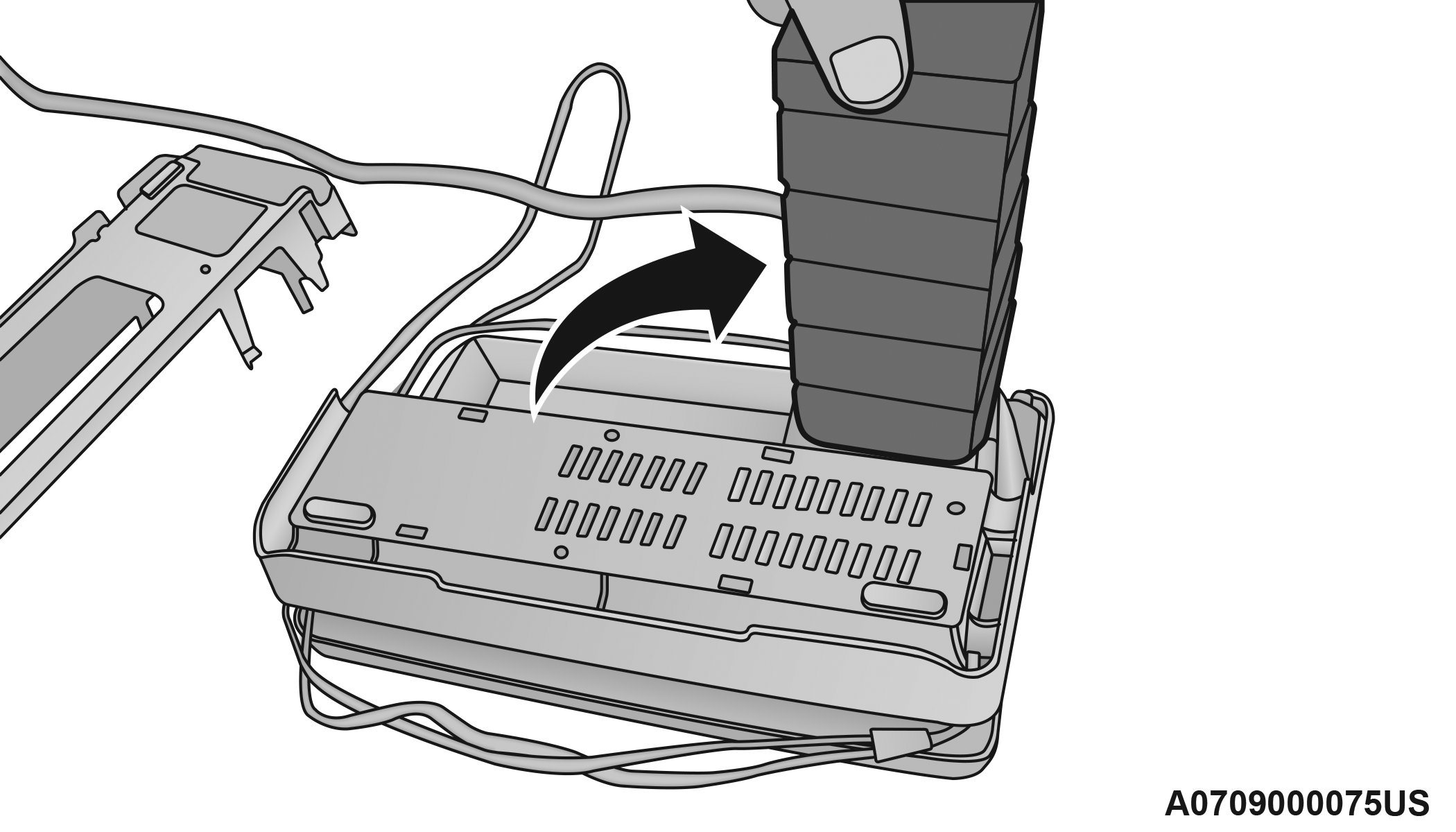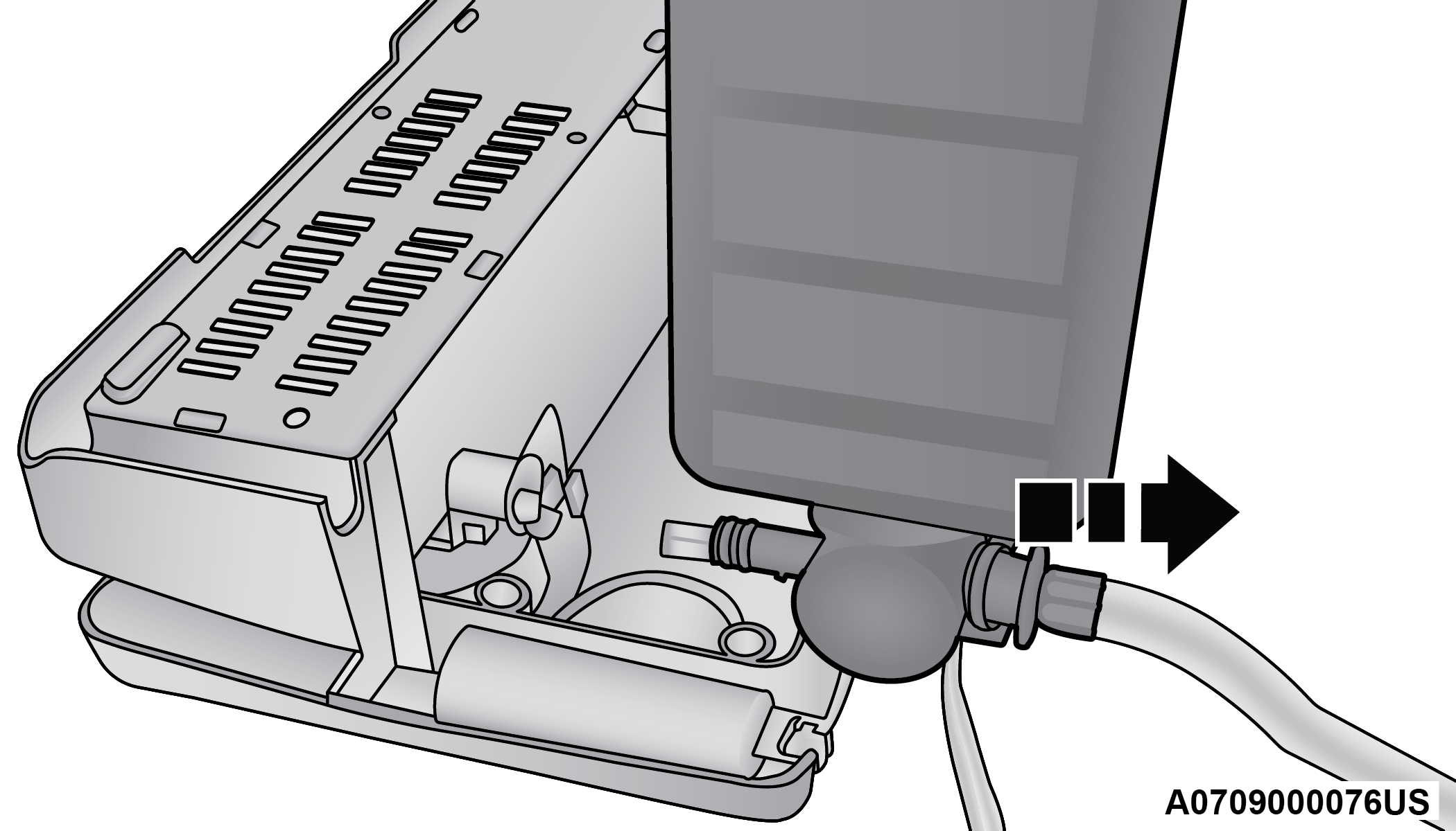Position the new Sealant Bottle in the housing so that the Sealant Hose aligns with the hose slot in the front of the housing. Push the bottle into the housing. An audible click will be heard indicating the bottle is locked into place.