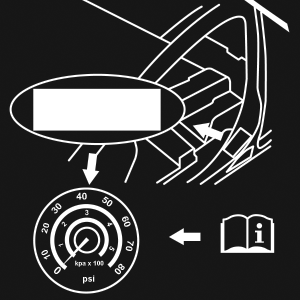 The pump will start to inject air into the tire immediately after the Sealant Bottle is empty. Continue to operate the pump and inflate the tire to the pressure indicated on the tire pressure label on the driver-side latch pillar (recommended pressure). Check the tire pressure by looking at the Pressure Gauge.