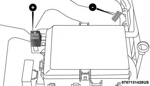 - Connect the opposite end of the negative (-) jumper cable to the remote negative (-) post (exposed metallic/unpainted post of the discharge vehicle) located directly behind the under-hood fuse box
