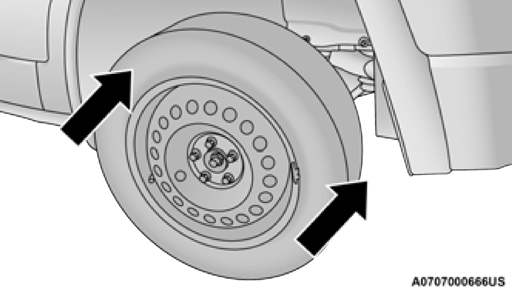 - Block both the front and rear of the wheel diagonally opposite of the jacking position using the provided wheel chocks. For example, if changing the driver’s front tire, chock the passenger’s rear wheel. Place both chocks under the tire.