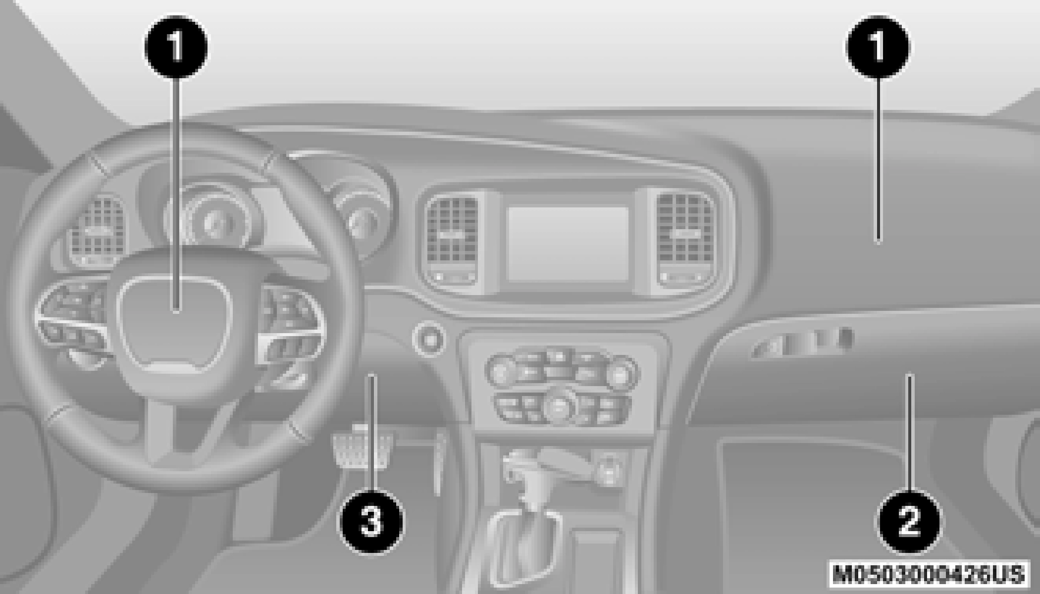 Front Air Bag/Knee Bolster Locations 1 — Driver And Passenger Front Air Bags 2 — Passenger Knee Impact Bolster