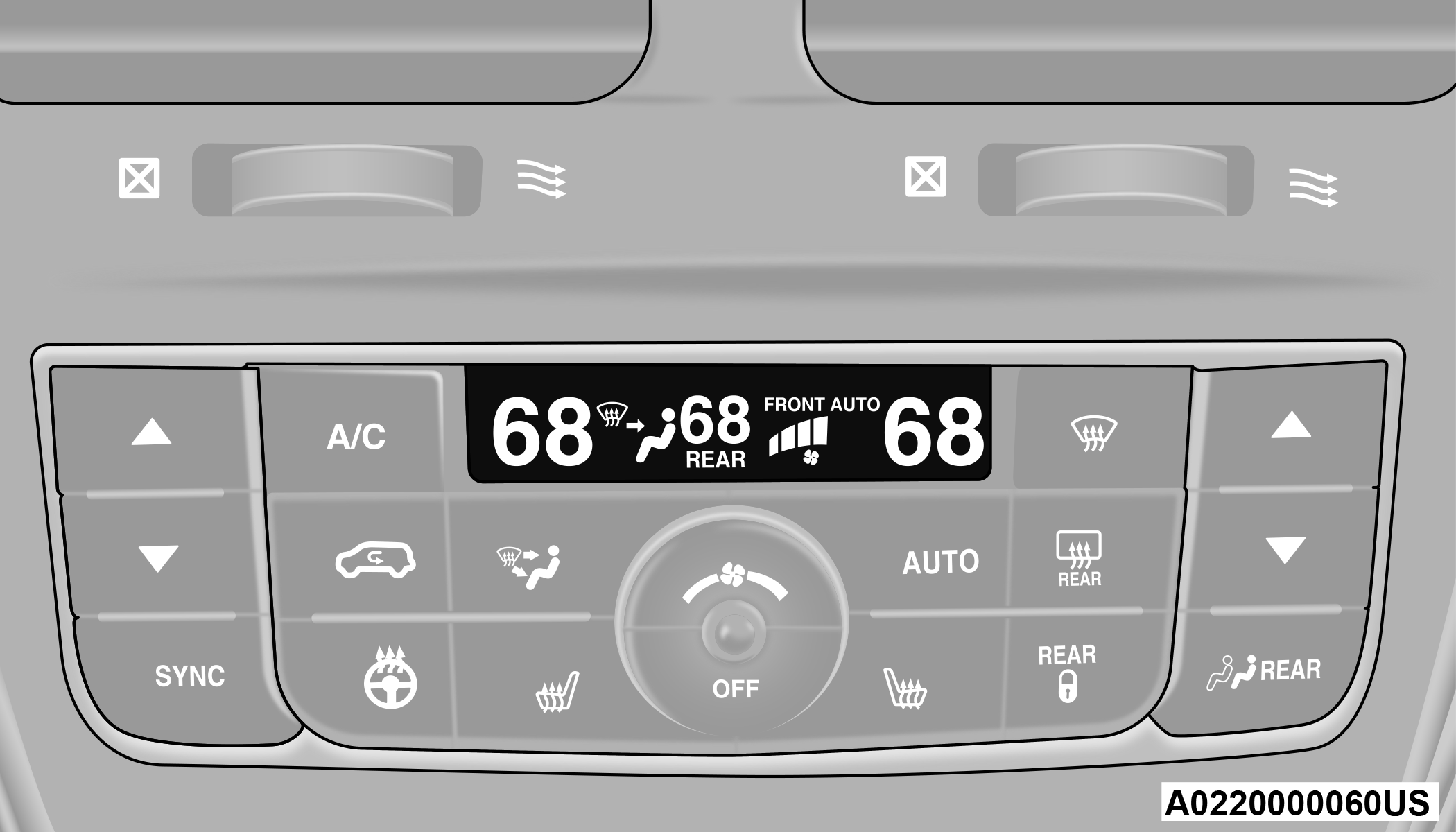 SYNC Button — If Equipped Press the SYNC button to toggle the Sync feature on/off. The SYNC indicator is illuminated when this feature is enabled. SYNC is used to synchronize the front and rear passenger temperature settings with the driver temperature setting. Changing the front or rear passenger temperature setting while in SYNC will automatically exit this feature. |