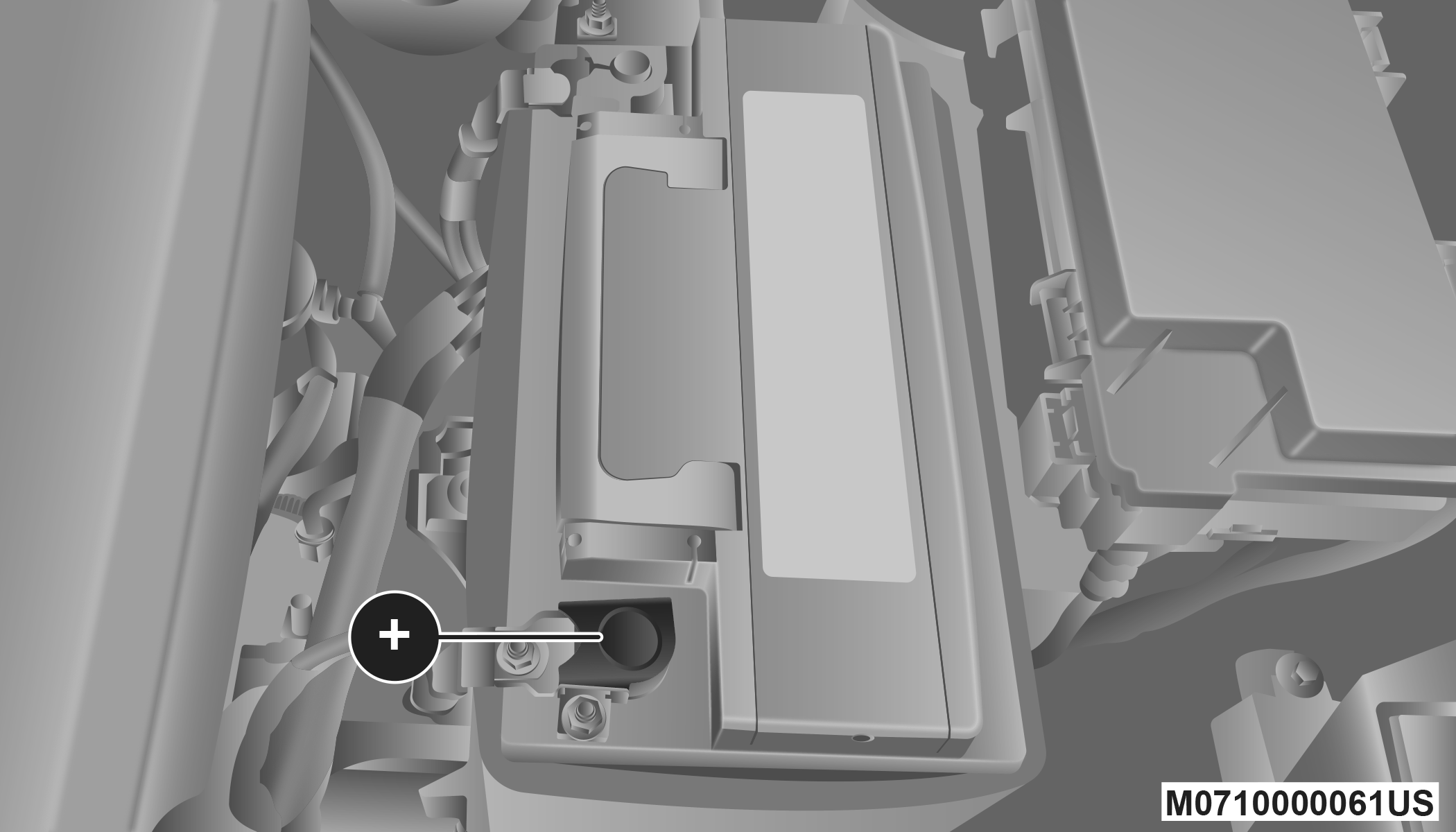 Do not connect the jumper cable to the negative (-) post of the discharged battery. The resulting electrical spark could cause the battery to explode and could result in personal injury. Only use the specific ground point, do not use any other exposed metal parts.