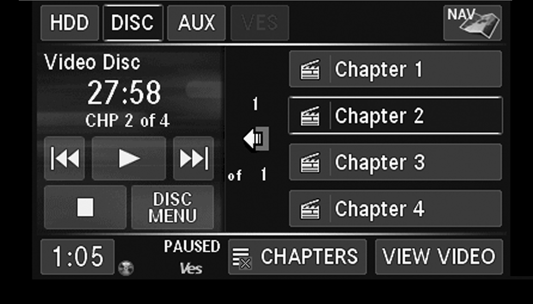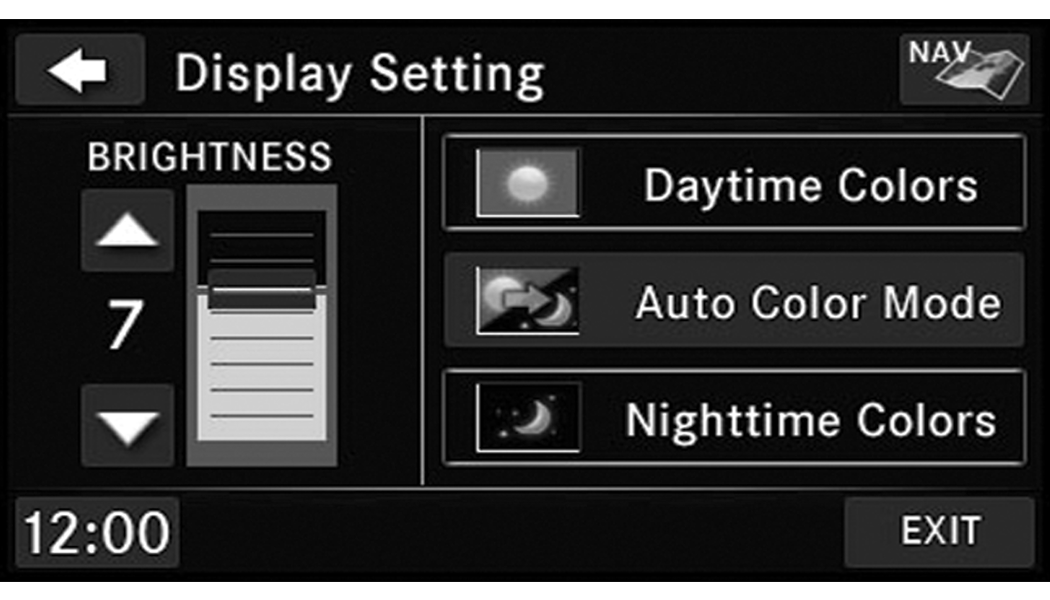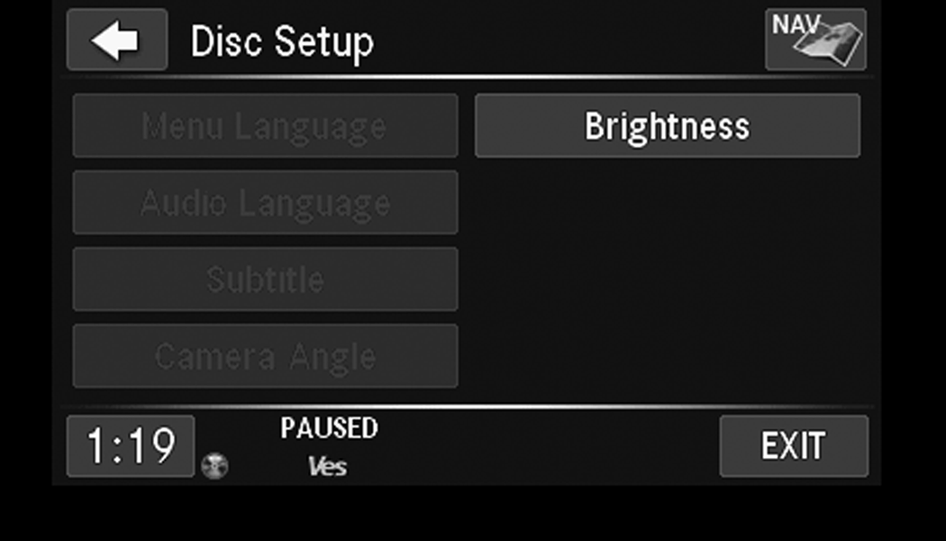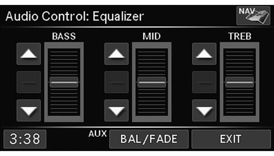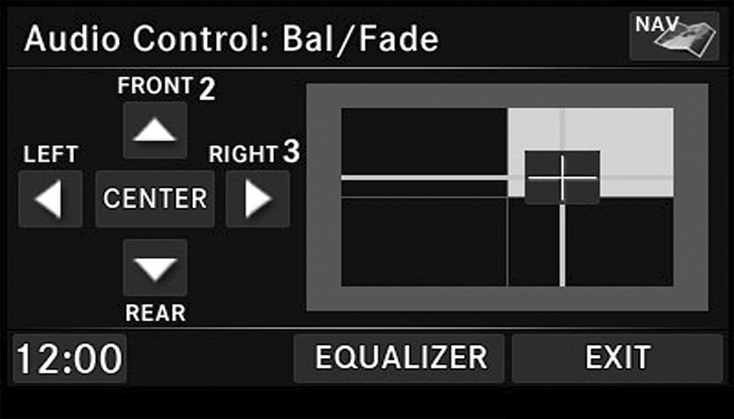 Use either of the Arrow buttons or the cross-hair on the screen to change the Balance and Fade. The Center button resets the settings. Push the Equalizer button to change tone settings.