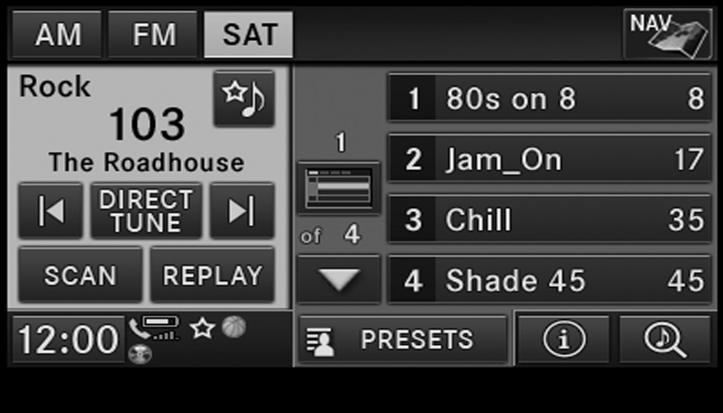 To store the desired station, press and hold one of the station Presets buttons for two seconds and you will see the highlighted button change from green to beige. You will also see the radio station stored in the highlighted button and you will hear a confirmation beep when the station is saved. Pressing the Presets buttons in SAT mode changes the information shown in the list between the Channel Name, name of the Artist currently playing on the channel and name of the Song currently playing on the channel.