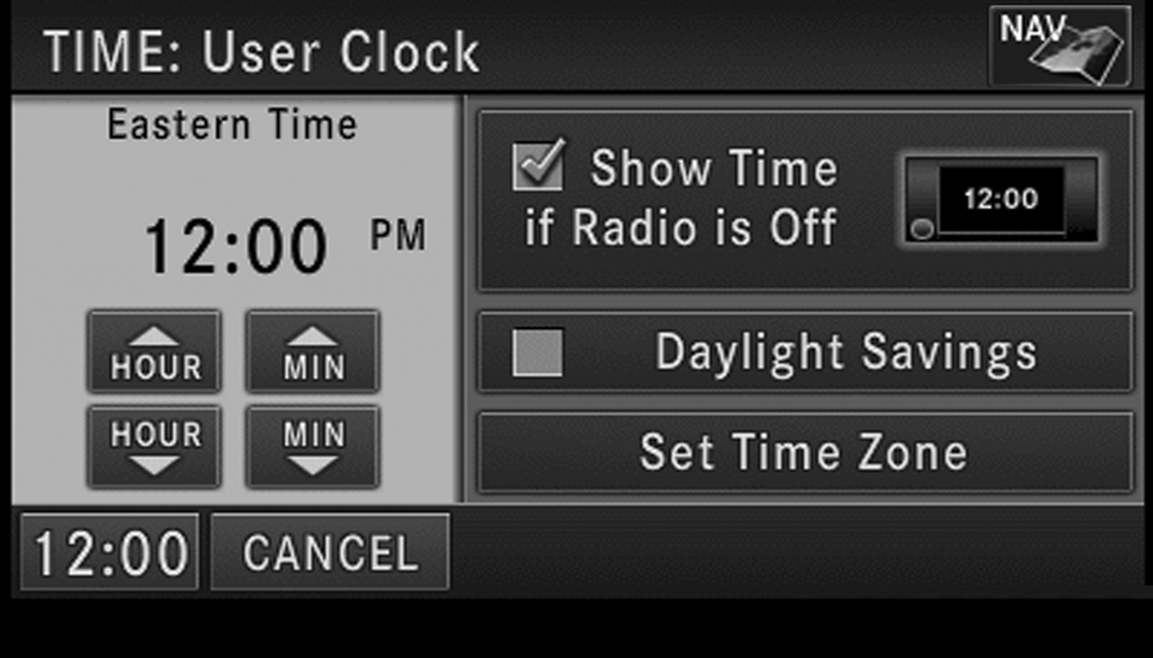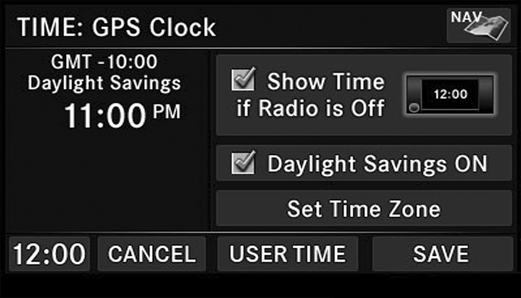 The time is automatically set by the GPS system for the time zone selected. The radio default is GPS time, where the vehicle time is automatically set by the GPS system. If the vehicle is not able to receive the GPS signals, the vehicle time is only updated when the GPS satellite signals are being received (which requires the vehicle to be outside with a clear view to the sky).