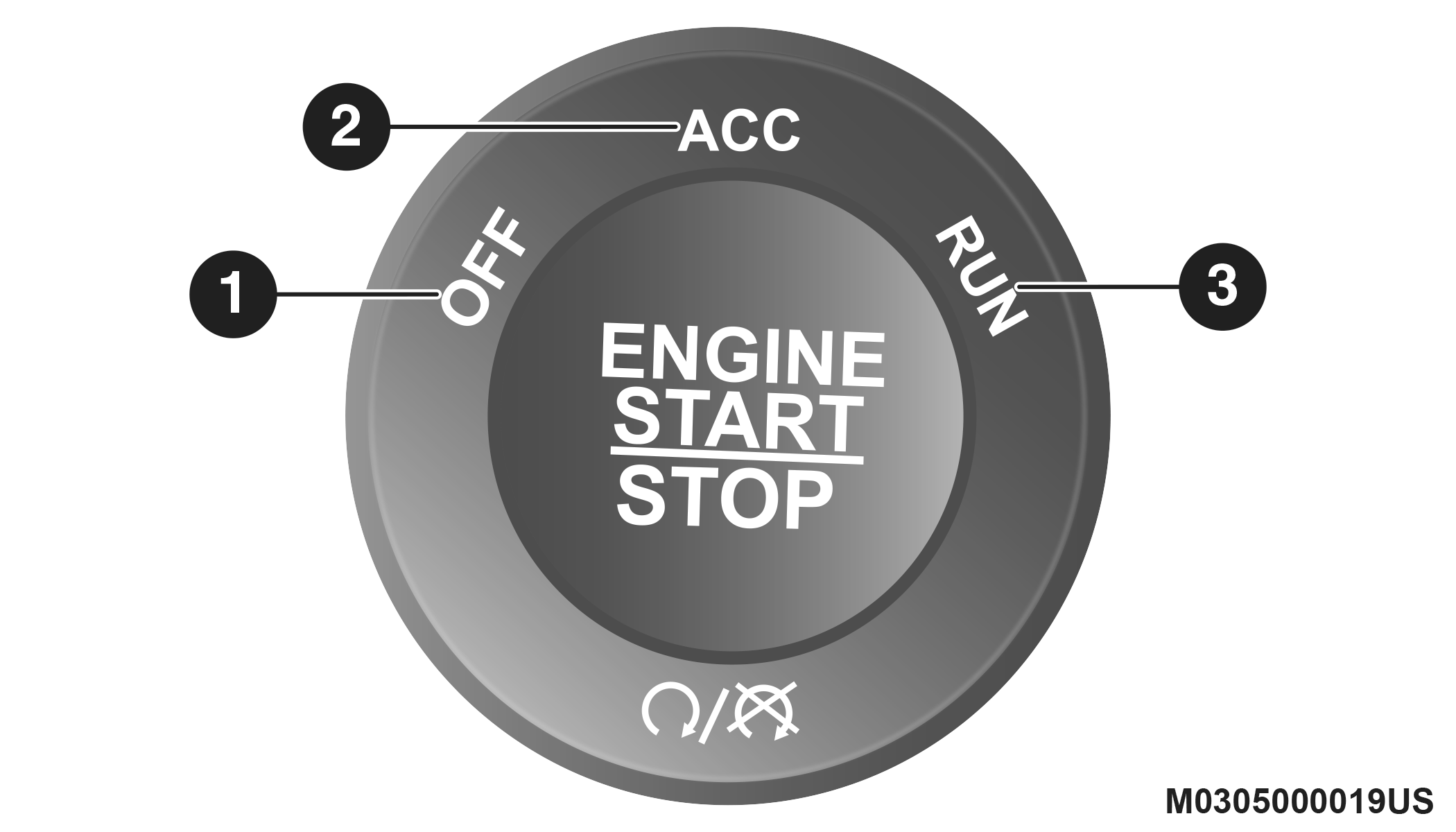 The Keyless Push Button Ignition has four operating positions, three of which are labeled and will illuminate when in position. The three positions are OFF, ACC, and ON/RUN. The fourth position is START. During START, RUN will illuminate.