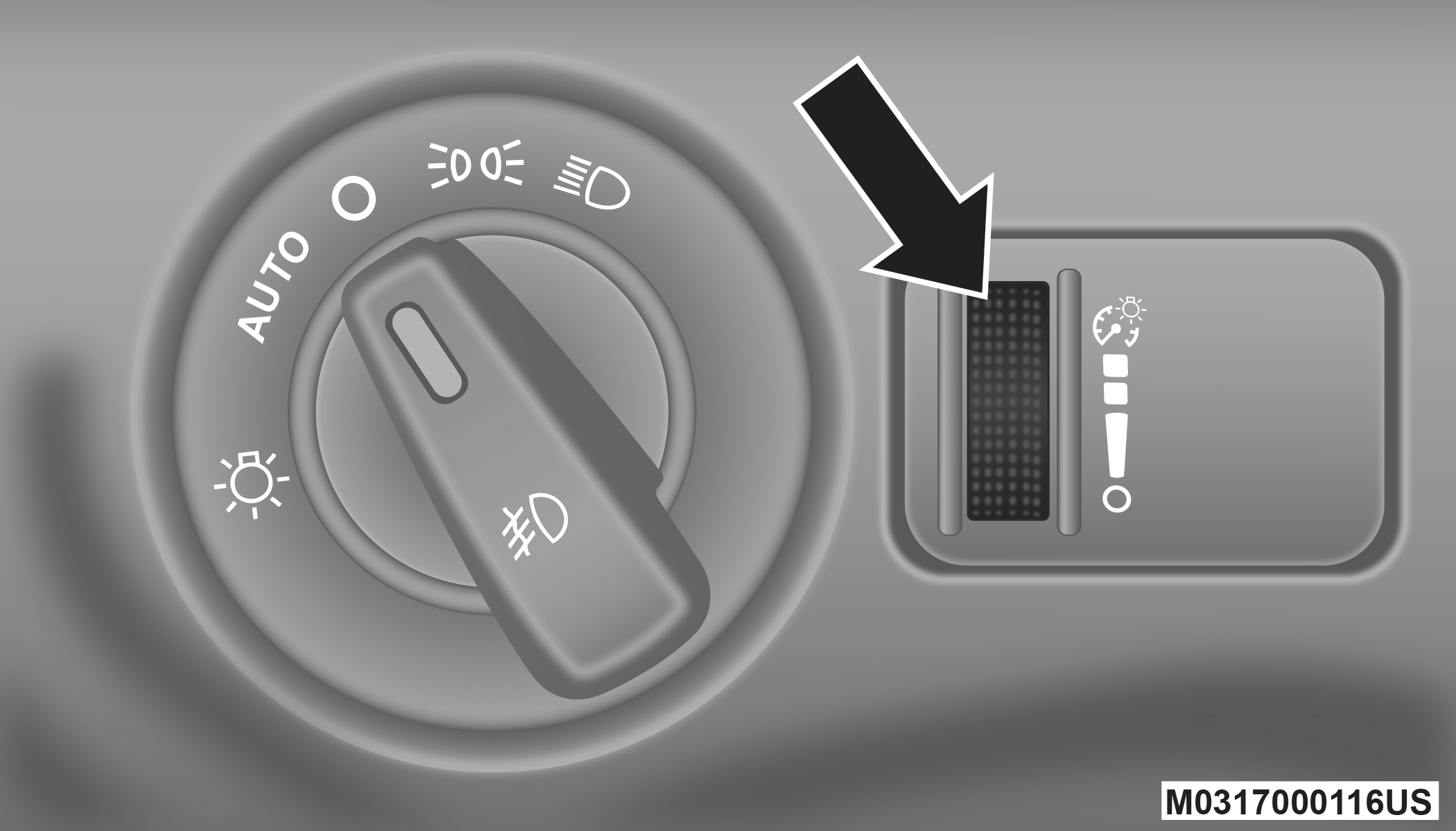 Rotate the dimmer control upward to the first detent. This feature brightens all text displays such as the odometer, instrument cluster display, and radio when the parking lights or headlights are on.