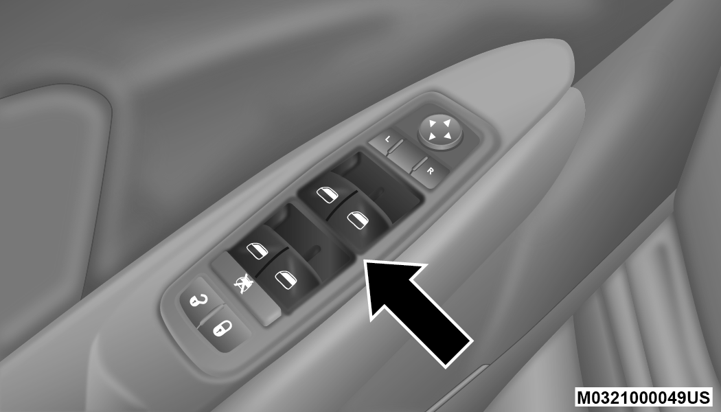 There are single window controls on each passenger door trim panel, which operate the passenger door windows. The window controls will operate when the ignition is in the ON/RUN or ACC position.