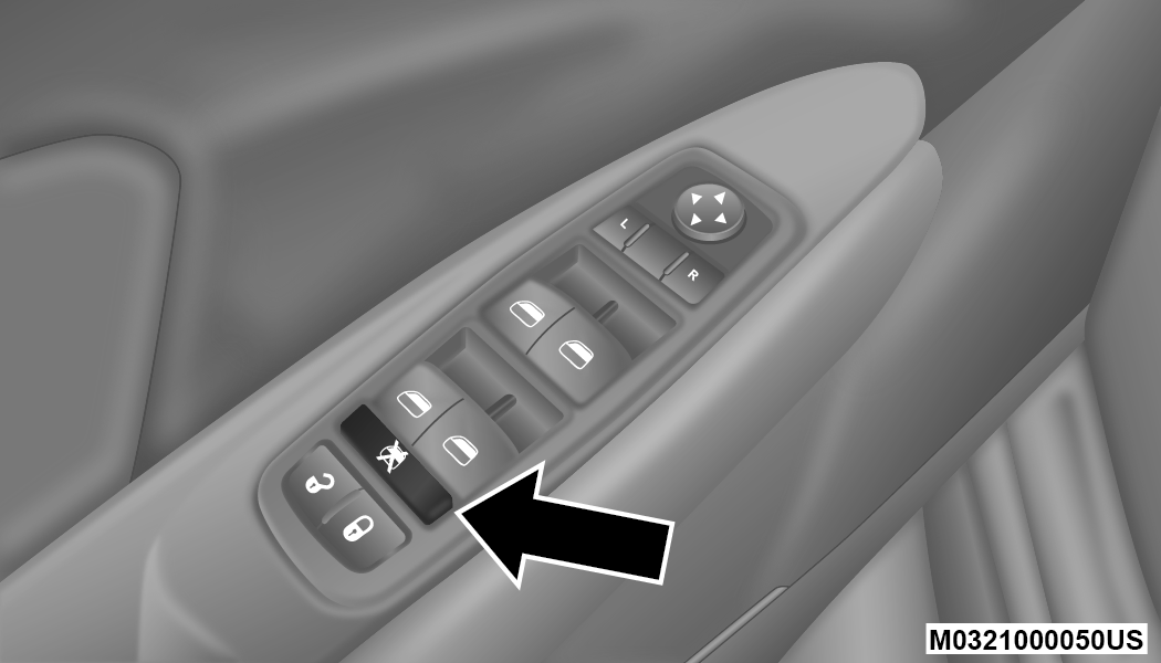 The window lockout switch on the driver's door trim panel allows you to disable the window control on the rear passenger doors. To disable the window controls, push and release the window lockout button (setting it in the down position). To enable the window controls, push and release the window lockout button again (setting it in the up position).