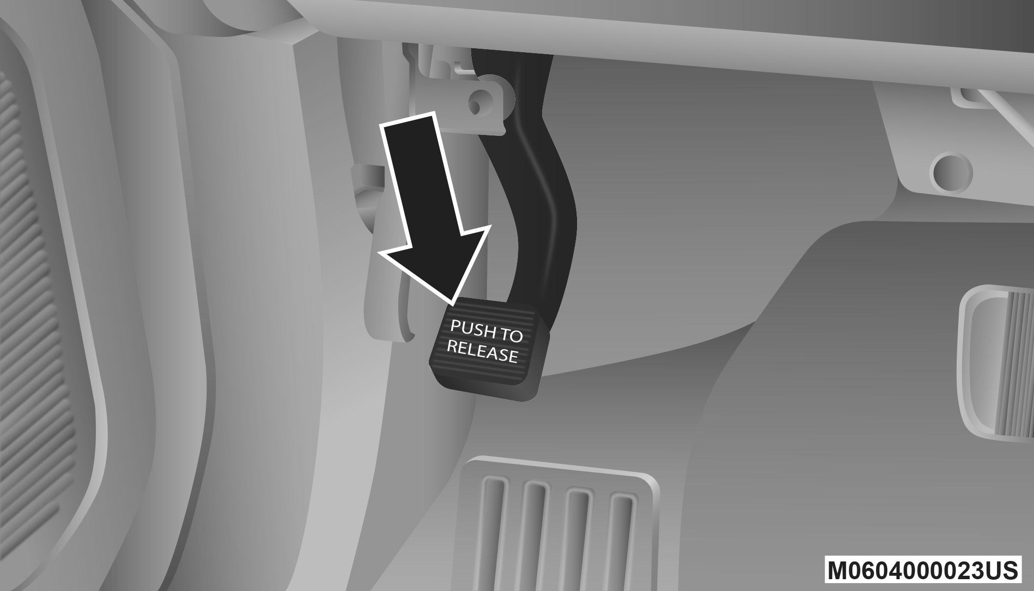 The foot operated parking brake is located below the lower left corner of the instrument panel. To apply the parking brake, firmly push the parking brake pedal fully. To release the parking brake, press the parking brake pedal a second time and let your foot up as you feel the brake disengage.