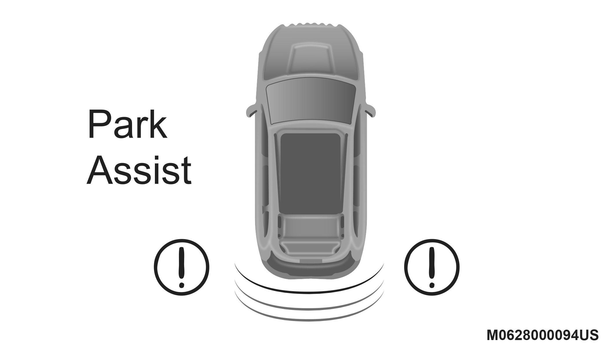 The system will indicate a detected obstacle by showing three solid arcs and will produce a one-half second tone. As the vehicle moves closer to the obstacle, the instrument cluster display will show fewer arcs and the sound tone will change from slow, to fast, to continuous.